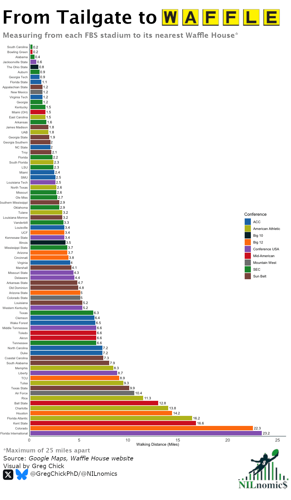 This analysis required me to enter the city of each stadium into the Waffle House website’s locations page to find the closest location to the city. From there I just used Google Maps to enter the stadium’s name and the city of the nearest Waffle House location. Using the walking distance estimator, I used the first Waffle House that popped up to identify the closest location. To make this chart a bit easier to read, I did exclude all the institutions with a Waffle House more than 25 miles away. As you can see in my Quick Takeaways, I noted the stadiums furthest away from a Waffle House, but you can find all the FBS stadiums/Waffle House distances in the raw data.