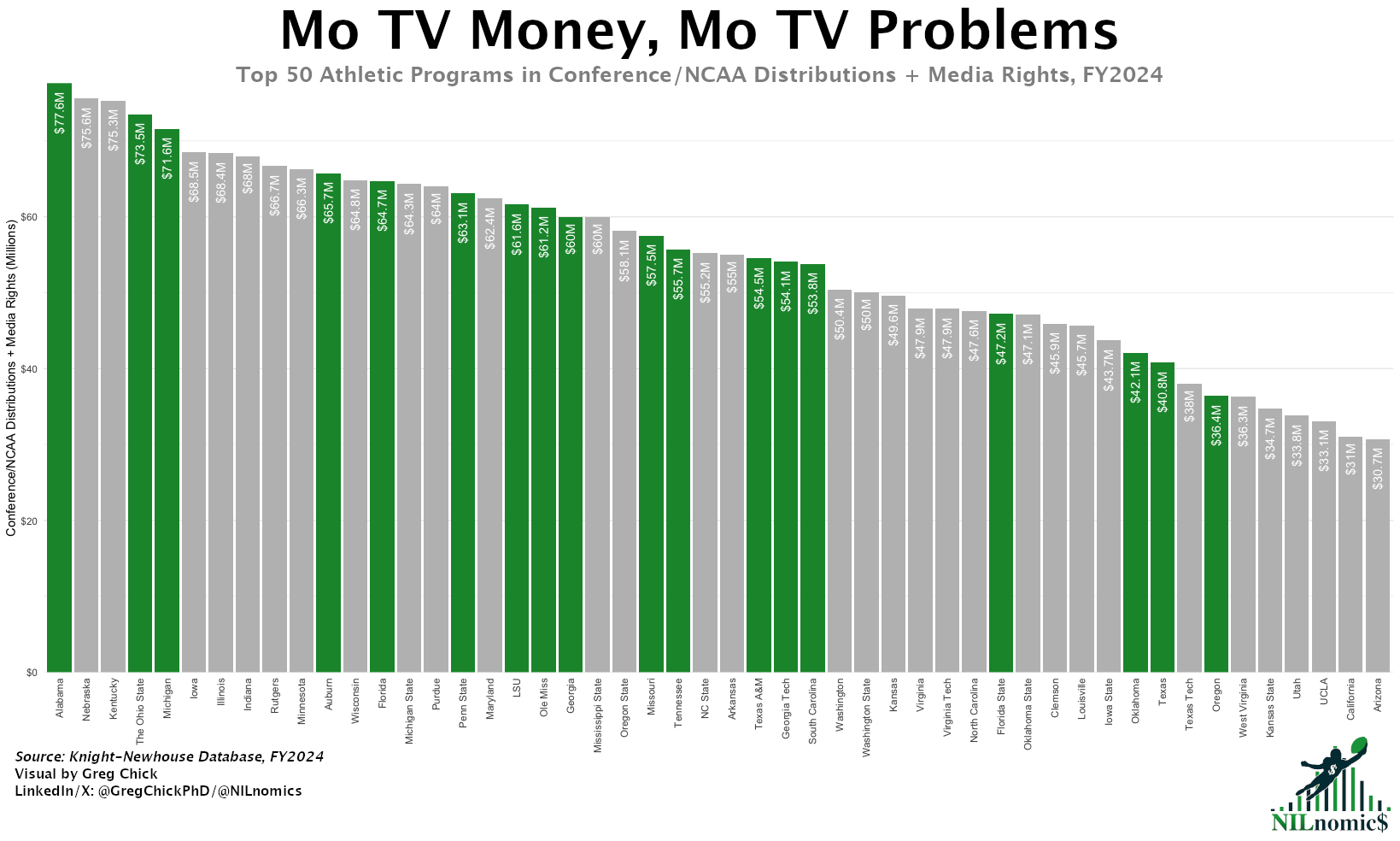 To understand this, I’m going to make an imperfect comparison. The latest data we have for media rights revenue has two issues. First, it’s from the 2023 season (2024 data was released just this week and I’m still assembling it). Second, the category that the Knight-Newhouse database uses combines media rights with conference/NCAA/bowl distributions. So this data has a lot more than just media rights in it.