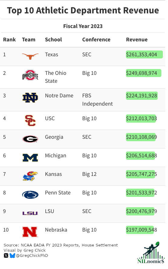 Just within the top ten there is a $64+ million disparity. While this may be the 1% of all athletic programs, there is a 1% of the 1% (looking at you Texas and Ohio State, both with over $240 million in annual revenue).