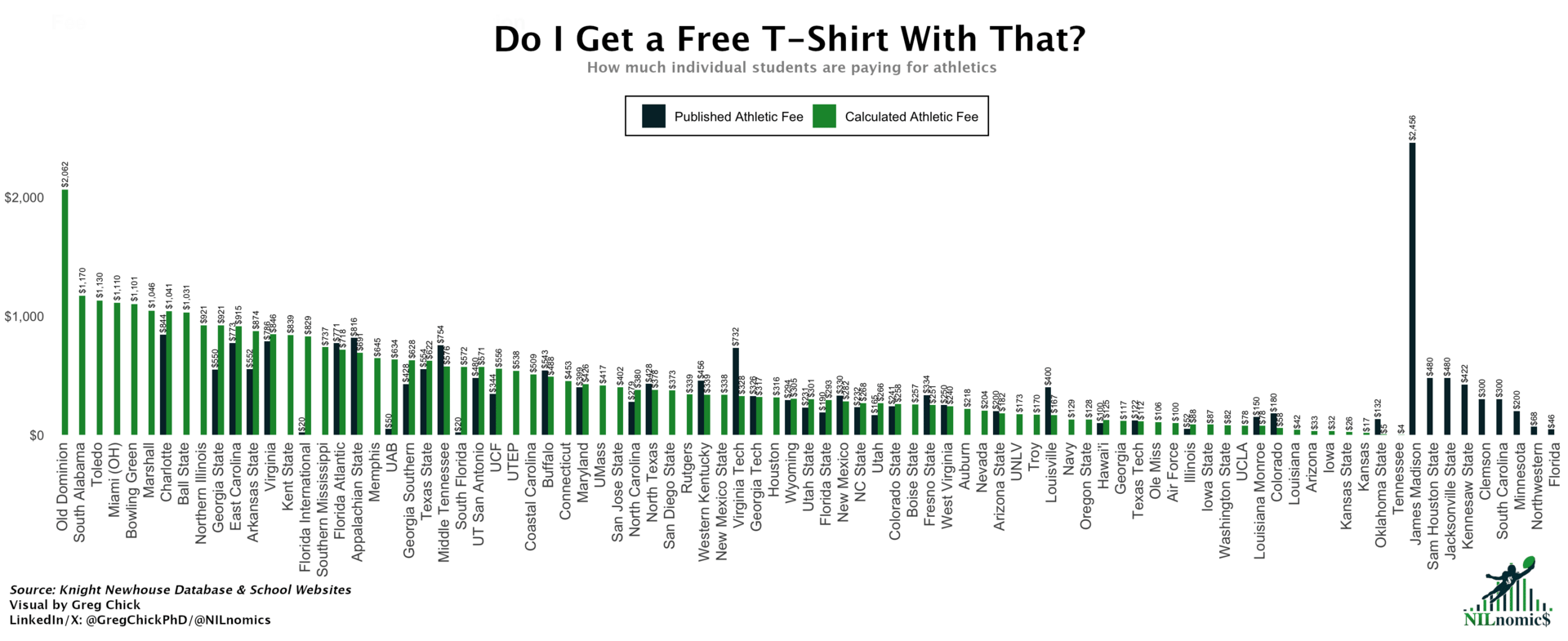 Maybe it’s not fair to use the last issue in this list, but so be it. It took alot of work to go over every FBS schools’ website and figure out if there was an athletics related fee. Interestingly, that was going to be all that I did. Then I had the thought to use the student fee data that schools report on their MFRS reports. And that’s how we got these charts.
