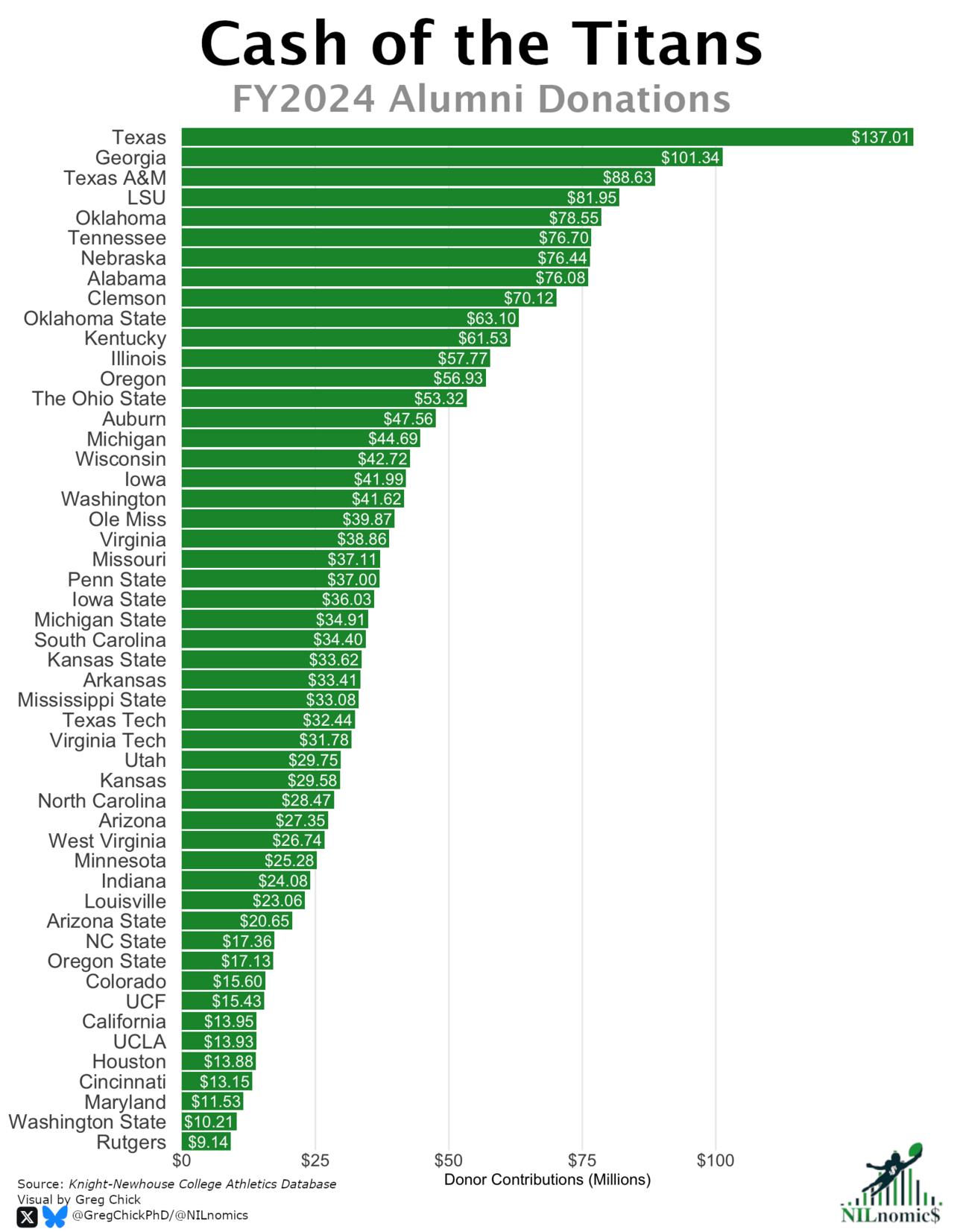 NILnomics is an independent data-driven newsletter uncovering the real numbers behind college sports finances with sharp insights, clear visuals, and exclusive datasets. Please send any thoughts, questions, or feedback to me at [email protected] and please follow me on X @NILnomics. Don’t forget all our data is available on Kaggle, code on GitHub, and FOIA documents on GoogleDrive. See you next week!