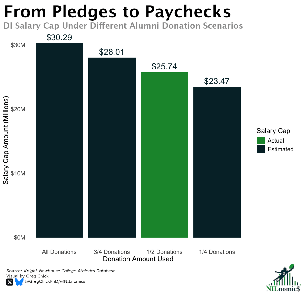As stated before, the sports economist Daniel Rascher assumed 50% of contributions were for goods and services. But what if the reality is different? Let’s look at what happens to the cap (just for fun) if the actual amount of athletic philanthropy that was for goods and services was 25% (for the player’s sake, I hope not), 75% (possible?), or 100% (unlikely, I hope). What happens to the salary cap in these situations?